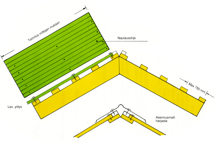 Asennusmalli harjasta Levyjen asennus vesikattoon Erityisohjeita Asennusmalli harjasta Asennusmalli päätylistasta